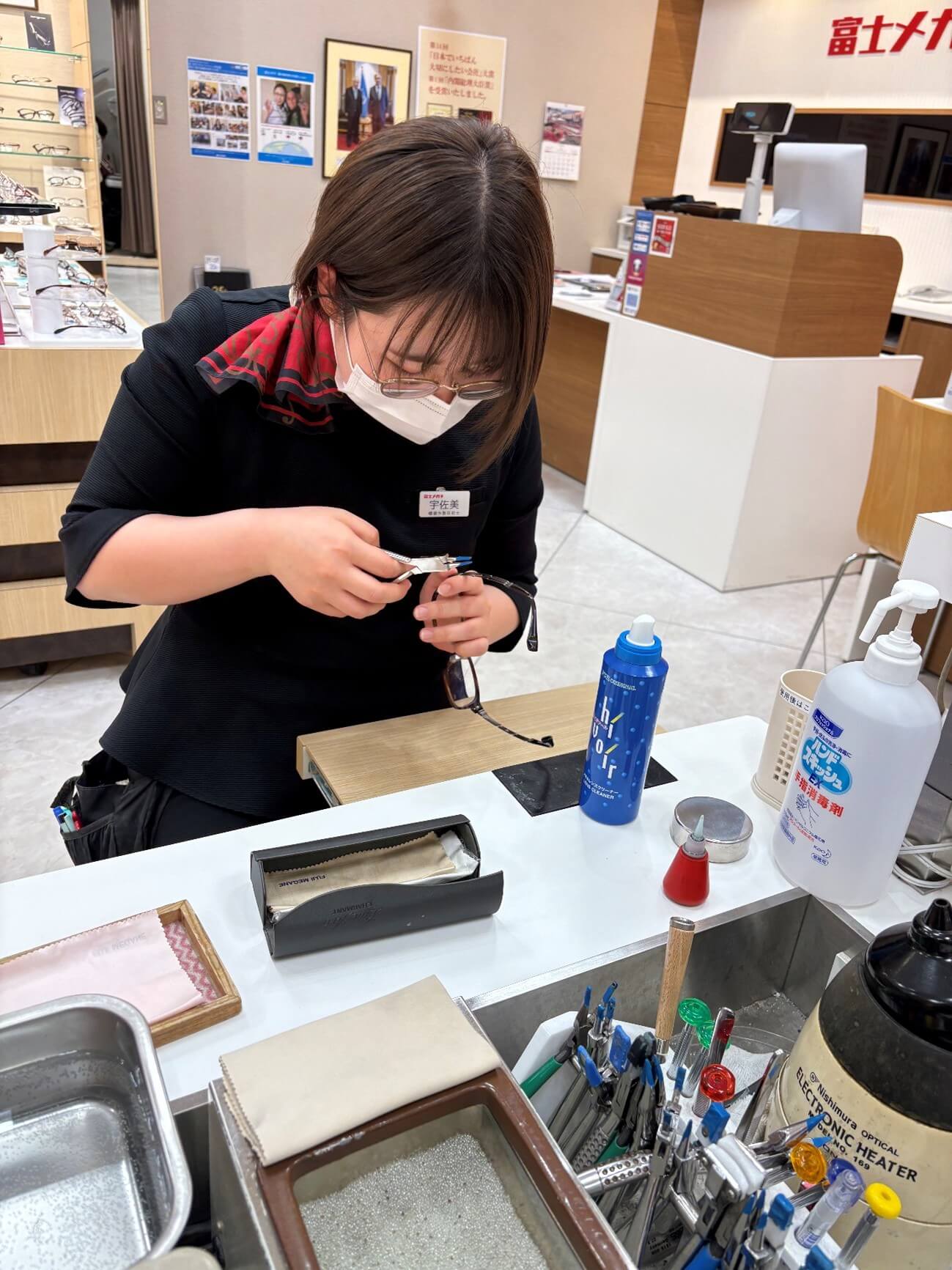 富士メガネでは、まずメガネの加工技術を学ぶそうです。 最初に加工技術を学んでおくと店舗でお客様のメガネを触った時に、どれくらいの力加減で調整すればいいかわかるそうです。