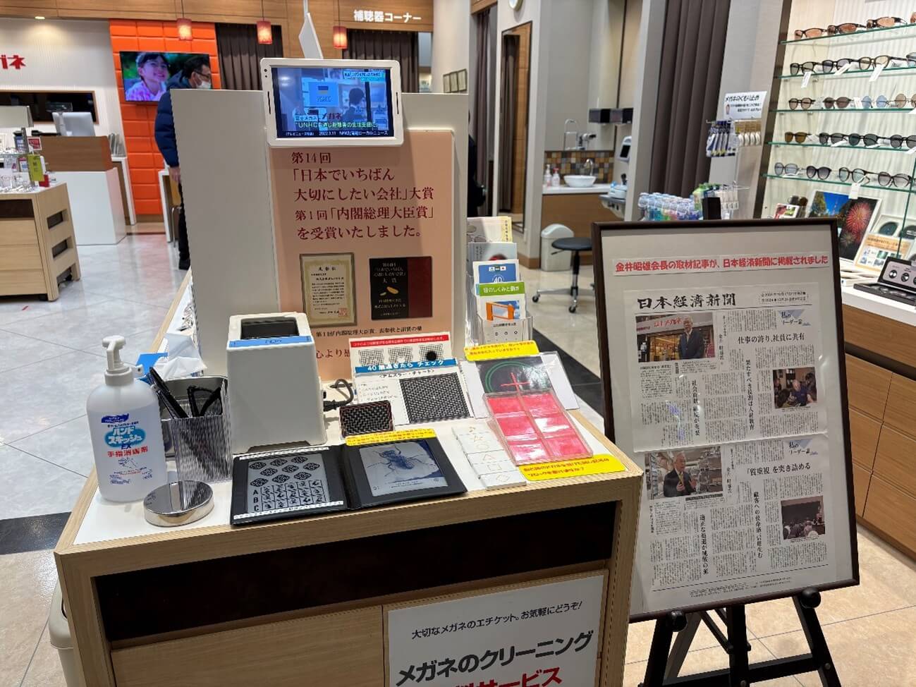 POPでは伝えきれない情報はデジタルサイネージを活用し、補聴器の情報や会社として取り組む視力支援活動の模様を流し、より詳しく訴求ポイントを説明しています。 また、相談カウンターでも会社のPR動画を再生し、ブランドイメージの向上や信頼度を上げる企業価値をアピールしています。